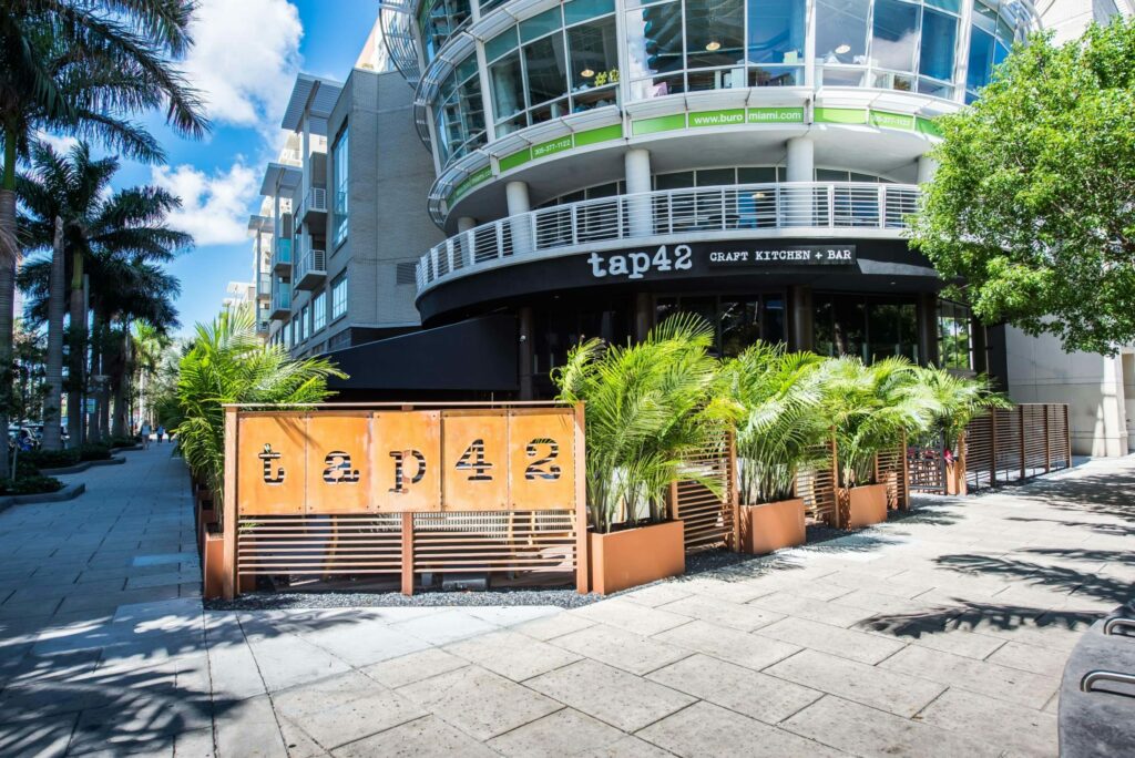 Tap 42 ist eine Craft Beer Bar & Kitchen mit modernen Interpretationen von Gastropub-Gerichten und einer Auswahl von über 42 Craft-Bieren. Tap 42 gehörte zu den ersten Konzepten in Südflorida, die charakteristisches architektonisches Design mit einer vom Küchenchef geleiteten Speisekarte und einem Craft-Bier- und Cocktail-Getränkeprogramm kombinierten.