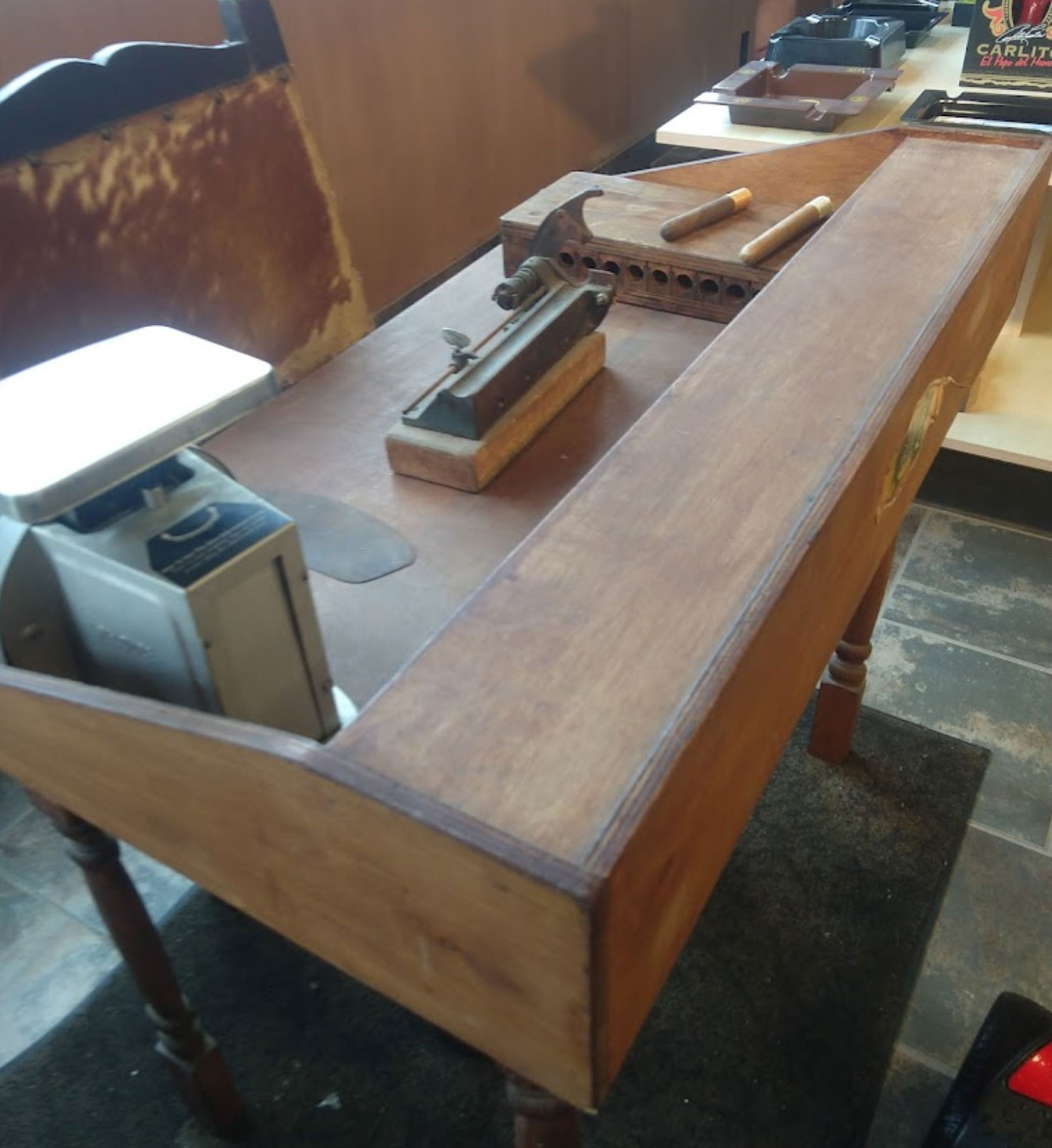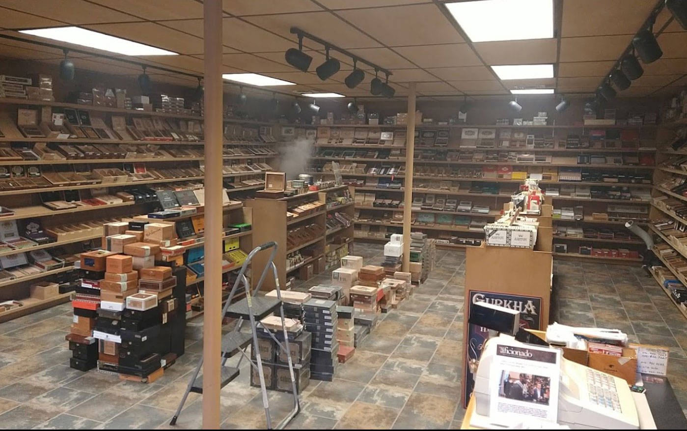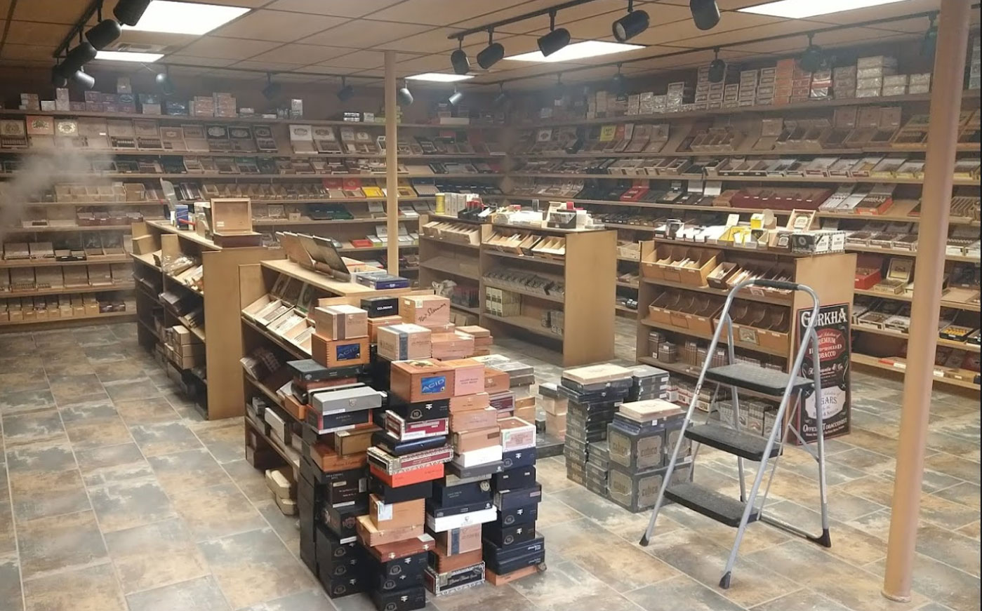 חנות סיגרים נינוחה עם מכשיר אדים מובנה ומבחר גדול.