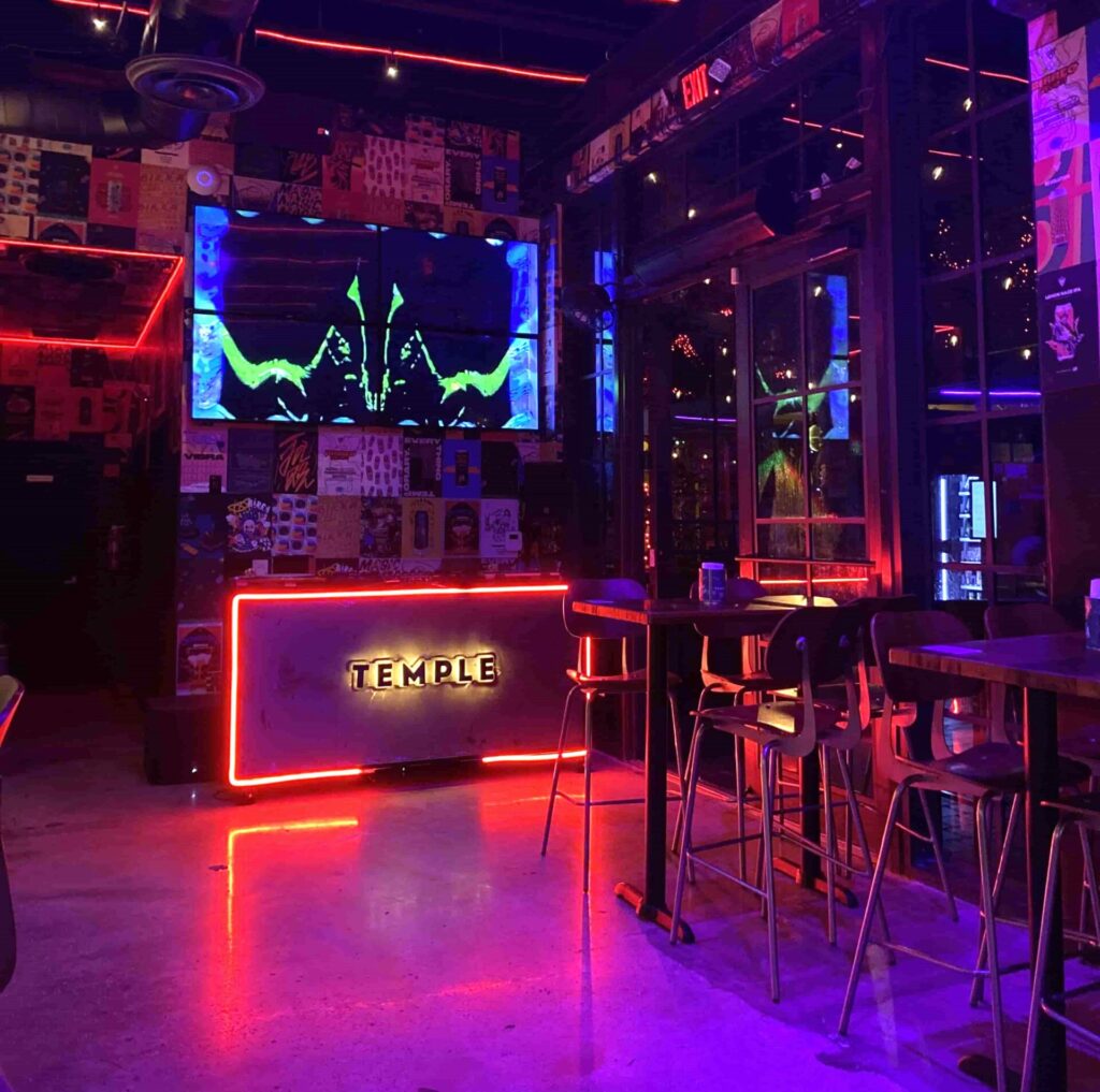 Vi är platsen och ursäkten för att mötas. Vi är rallyt. Vi är kall hantverksöl. Vi är "aaaah" av den första klunken. Temple är en bar som kombinerar gott hantverksöl och utsökt mat i ett förslag där framväxande konst är huvudpersonen. Vi är generatorer av underhållning, en plats där du kan fira med vänner och ha kul. Varje vecka har vi programmering med DJs, vinyl och livemusik för att göra vår plats till en upplevelse.